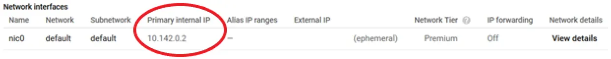Scroll down to Network Interfaces, and take note of the Primary Internal IP.