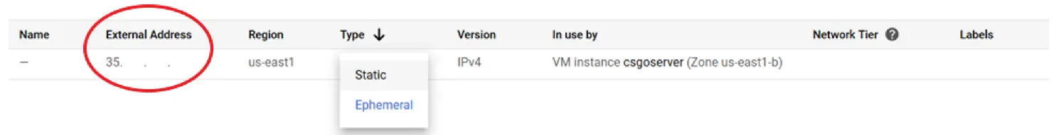 Change the type of your IP address to “Static”, and take note of the external IP address