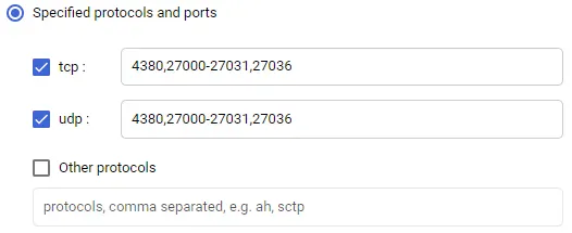 Check “udp”, and enter 4380,27000-27031,27036